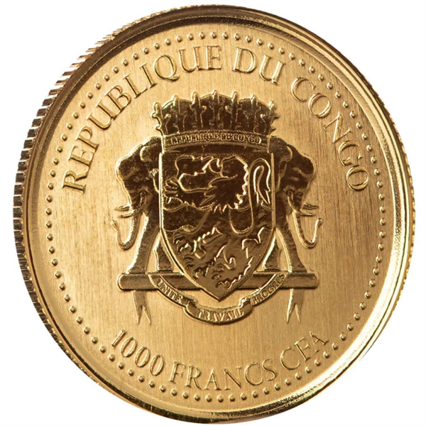 The gold coin containing the image of the Gorilla was made of pure Au.9999 gold, weighing 1/10 troy ounce. The product is also a full-fledged legal tender, guaranteed by the Government of the Republic of Congo. The product comes with individual original packaging. The Overt of the gold coin depicts the coat of arms of the Republic of Congo and information about the coin's face value. The Rewers shows the figure of an adult gorilla with a cub. The reverse also features information on the year the coin was minted, the weight and purity of the bullion.