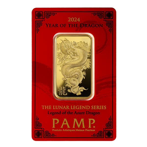 Celebrate the Year of the Dragon with the exquisitely crafted 2024 PAMP Suisse Lunar Legend “Azure Dragon” Gold Bar. Part of PAMP’s prestigious Lunar Legend series, this bar showcases rich Chinese symbolism and world-class Swiss minting excellence—making it a standout collector's item and an auspicious gift. The Azure Dragon is one of the Four Mythical Beasts in Chinese tradition and governs the East and the element of wood. It is considered the most powerful creature of the Chinese zodiac and is revered for bringing protection, wealth, and new beginnings—especially meaningful in 2024, the Year of the Wood Dragon.