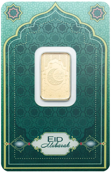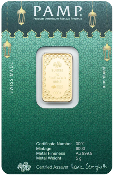 Celebrate the spirit of Eid with the wonderfully designed 5g PAMP Eid Mubarak Gold Bar (999.9), which is constructed of 24-karat pure gold with excellent Swiss precision. PAMP Suisse created this limited-edition bar with stunning Eid Mubarak lettering, making it both a memorable gift and a timeless investment.