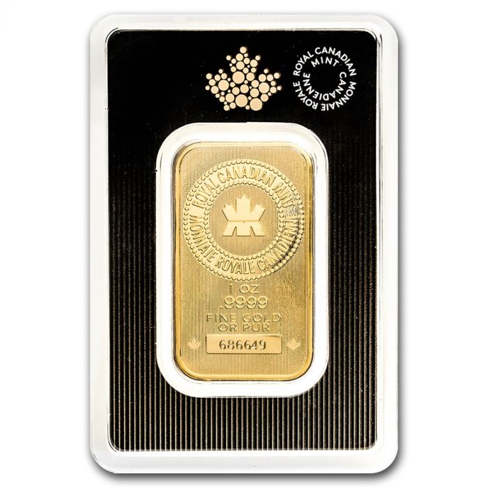 The Royal Canadian Mint (RCM) is a Crown Corporation, wholly owned by the Federal Government of Canada. Located in Ottawa, it was originally established as the Ottawa Branch of The Royal Mint, which opened in 1908. Apart from minted bars, the RCM has manufactured London Good Delivery 400 oz bars since 1919 (est), 100 oz bars since 1981 (est), and kilobars since 1984 (est). The one ounce Royal Canadian Mint gold bar was first minted in 2001. The bar was primarily designed for the overseas market. The gold bar is individually numbered, contains 1 oz of .9999 fine gold and comes with an assay card.