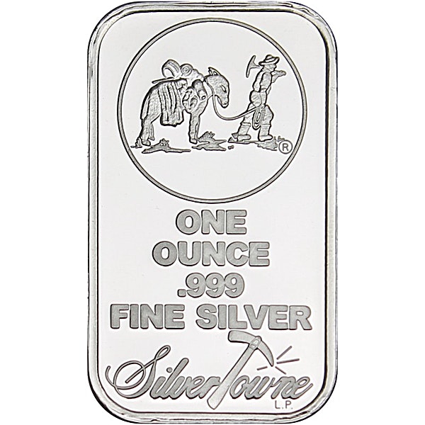 The obverse design features the SilverTowne Trademark prospector and his trusty burro on the front in a perfect circle with the SilverTowne logo at the bottom along with the silver purity and weight designation of "ONE OUNCE .999 FINE SILVER".