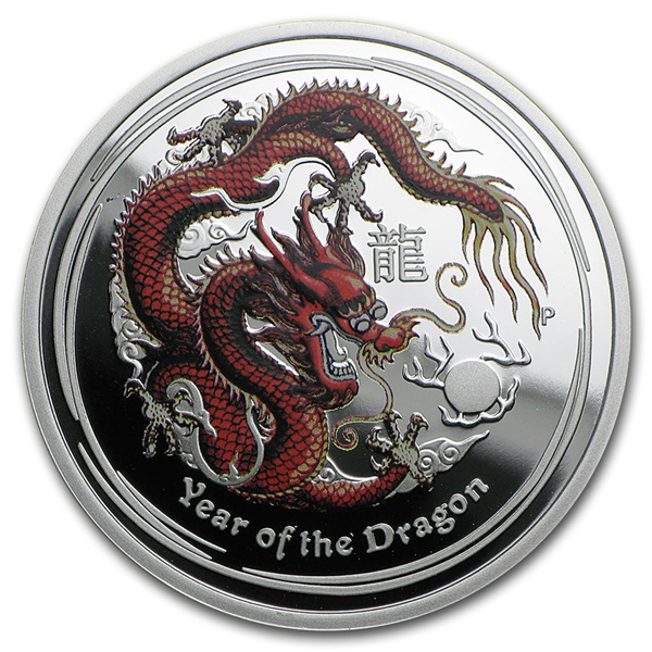 The 2012 Proof Silver colorized Lunar Year of the Dragon features a traditional Chinese dragon, a long, scaled, serpentine creature with four legs and a "pearl of wisdom" and the Chinese character for "dragon."