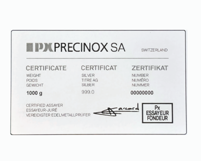 The Silver PX Precinox Cast Bar (1 kg) is a solid, traditional-style bullion bar made of 99.9% pure silver, produced by Precinox SA of Switzerland, known for high quality and LBMA accreditation, offering an easily tradable investment for individuals and institutions, typically sold with an Assay certificate guaranteeing weight and purity.